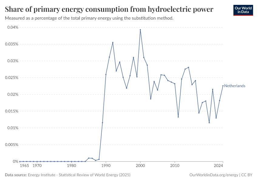 Energy Institute - Statistical Review of World Energy (2025) – with major processing by Our World in Data. “Share of primary energy consumption that comes from hydropower – Using the substitution method” [dataset]. Energy Institute, “Statistical Review of World Energy” [original data]. Retrieved December 24, 2025 from https://archive.ourworldindata.org/20250909-093708/grapher/hydro-share-energy.html (archived on September 9, 2025).