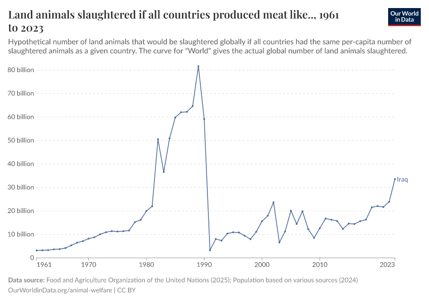 Food and Agriculture Organization of the United Nations (2025); Population based on various sources (2024) – with major processing by Our World in Data. “Land animals slaughtered if all countries produced meat like.. – FAO” [dataset]. Food and Agriculture Organization of the United Nations, “Production: Crops and livestock products”; Various sources, “Population” [original data]. Retrieved December 5, 2025 from https://archive.ourworldindata.org/20251014-163147/grapher/hypothetical-land-animals-slaughtered.html (archived on October 14, 2025).