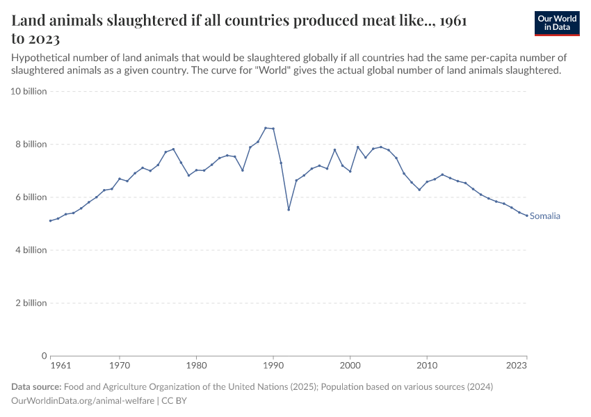 Food and Agriculture Organization of the United Nations (2025); Population based on various sources (2024) – with major processing by Our World in Data. “Land animals slaughtered if all countries produced meat like.. – FAO” [dataset]. Food and Agriculture Organization of the United Nations, “Production: Crops and livestock products”; Various sources, “Population” [original data]. Retrieved December 5, 2025 from https://archive.ourworldindata.org/20251014-163147/grapher/hypothetical-land-animals-slaughtered.html (archived on October 14, 2025).
