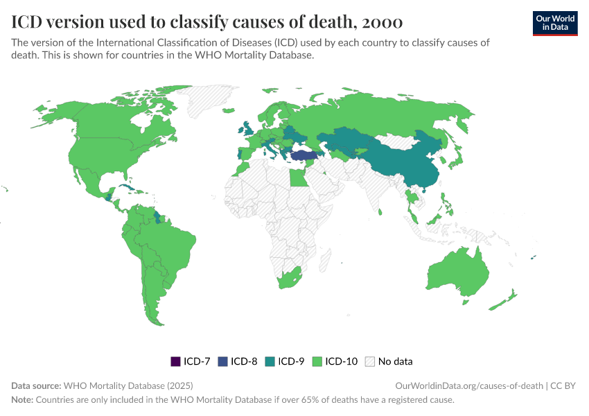 WHO Mortality Database (2025) – processed by Our World in Data. “ICD version used to classify causes of death” [dataset]. WHO Mortality Database, “ICD Codes” [original data]. Retrieved December 13, 2025 from https://archive.ourworldindata.org/20250909-093708/grapher/icd-code-version-used-to-classify-causes-of-death.html (archived on September 9, 2025).