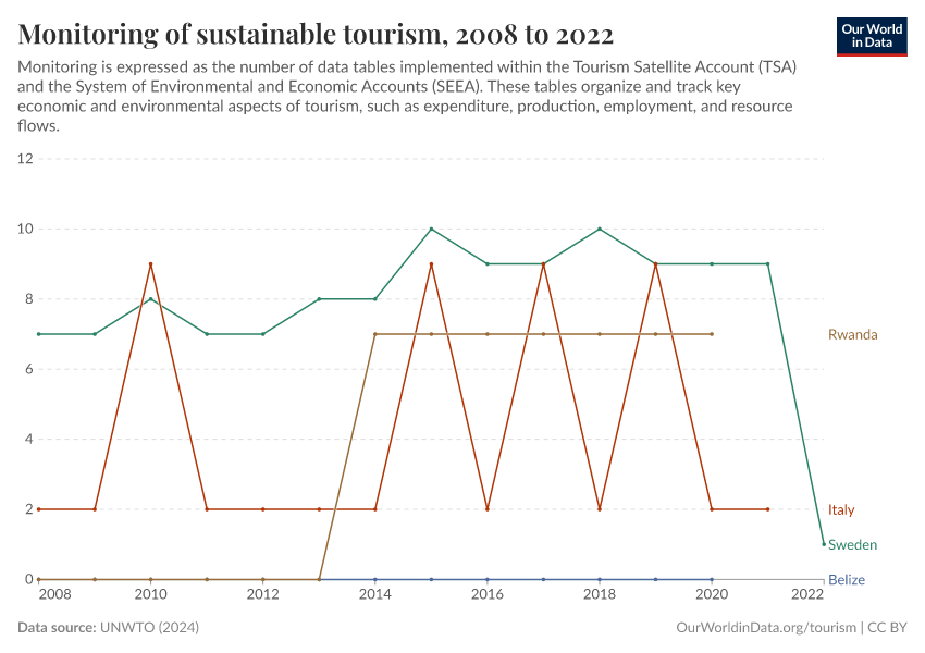 UNWTO (2024) – processed by Our World in Data. “Monitoring of sustainable tourism” [dataset]. UNWTO, “Implementation of standards accounting tools to monitor the economic and environmental aspects of tourism sustainability” [original data]. Retrieved December 18, 2025 from https://archive.ourworldindata.org/20250909-093708/grapher/implementation-of-tools-to-monitor-economic-and-environmental-tourism.html (archived on September 9, 2025).