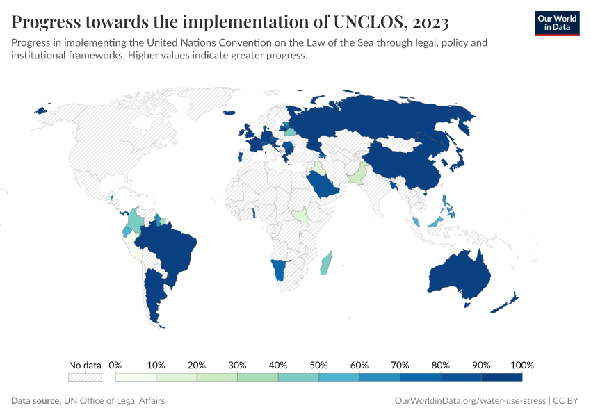 “Data Page: Progress towards the implementation of UNCLOS”. Our World in Data (2025). Data adapted from UN Office of Legal Affairs. Retrieved from https://archive.ourworldindata.org/20251120-211749/grapher/implementation-of-unclos.html [online resource] (archived on November 20, 2025).How to cite this data