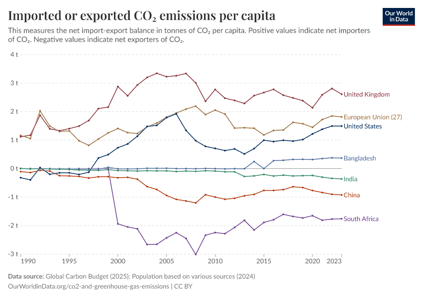 “Data Page: Imported or exported CO₂ emissions per capita”, part of the following publication: Hannah Ritchie, Pablo Rosado, and Max Roser (2023) - “CO₂ and Greenhouse Gas Emissions”. Data adapted from Global Carbon Project, Various sources. Retrieved from https://archive.ourworldindata.org/20260402-173937/grapher/imported-or-exported-co-emissions-per-capita.html [online resource] (archived on April 2, 2026).How to cite this data