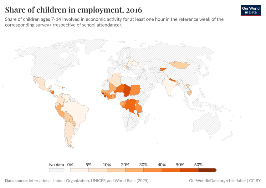 “Data Page: Share of children in employment”. Our World in Data (2025). Data adapted from International Labour Organization, UNICEF, and World Bank. Retrieved from https://archive.ourworldindata.org/20250923-151844/grapher/incidence-of-child-labour.html [online resource] (archived on September 23, 2025).How to cite this data
