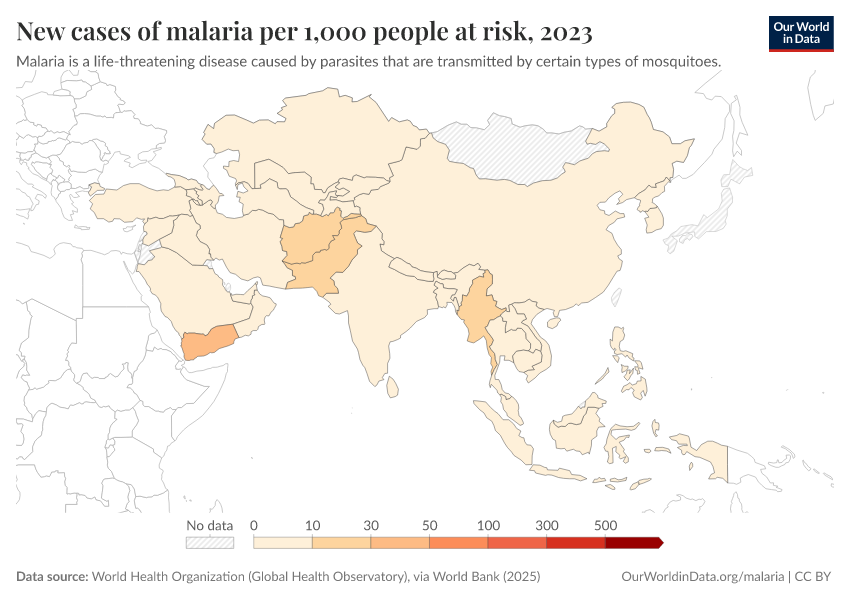 “Data Page: New cases of malaria per 1,000 people at risk”. Our World in Data (2026). Data adapted from World Health Organization (Global Health Observatory), via World Bank. Retrieved from https://archive.ourworldindata.org/20260112-111535/grapher/incidence-of-malaria.html [online resource] (archived on January 12, 2026).How to cite this data