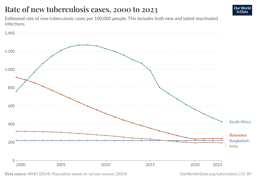 “Data Page: Rate of new tuberculosis cases”, part of the following publication: Saloni Dattani, Fiona Spooner, Hannah Ritchie, and Max Roser (2023) - “Tuberculosis”. Data adapted from WHO, Various sources. Retrieved from https://archive.ourworldindata.org/20250925-233948/grapher/incidence-of-tuberculosis-sdgs.html [online resource] (archived on September 25, 2025).How to cite this data