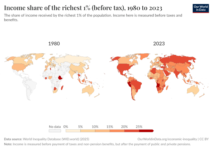 World Inequality Database (WID.world) (2025) – with major processing by Our World in Data. “Income share of the richest 1% (before tax) – World Inequality Database – Before tax” [dataset]. World Inequality Database (WID.world), “World Inequality Database (WID)” [original data]. Retrieved December 19, 2025 from https://archive.ourworldindata.org/20250909-093708/grapher/income-share-top-1-before-tax-wid.html (archived on September 9, 2025).