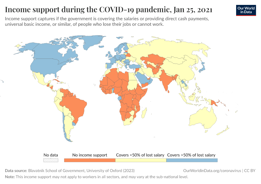 Blavatnik School of Government, University of Oxford (2023) – with minor processing by Our World in Data. “Income support during the COVID-19 pandemic” [dataset]. Blavatnik School of Government, University of Oxford, “Government Response Tracker (OxCGRT)” [original data]. Retrieved December 18, 2025 from https://archive.ourworldindata.org/20250909-093708/grapher/income-support-covid.html (archived on September 9, 2025).