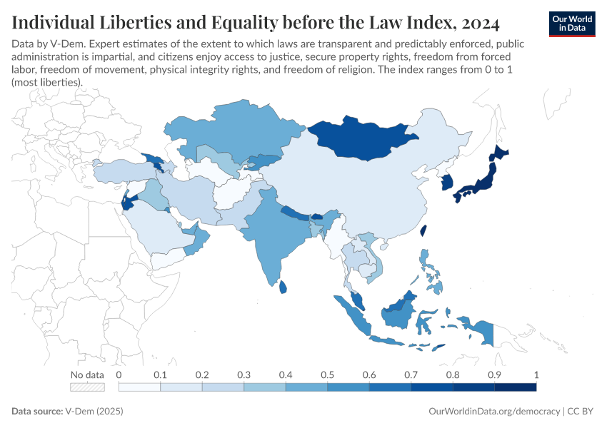 “Data Page: Equality before the law and individual liberty index”, part of the following publication: Bastian Herre, Lucas Rodés-Guirao, and Esteban Ortiz-Ospina (2013) - “Democracy”. Data adapted from V-Dem. Retrieved from https://archive.ourworldindata.org/20260105-133053/grapher/individual-liberties-and-equality-before-the-law-index.html [online resource] (archived on January 5, 2026).