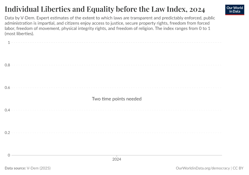 “Data Page: Equality before the law and individual liberty index”, part of the following publication: Bastian Herre, Lucas Rodés-Guirao, and Esteban Ortiz-Ospina (2013) - “Democracy”. Data adapted from V-Dem. Retrieved from https://archive.ourworldindata.org/20250925-233948/grapher/individual-liberties-and-equality-before-the-law-index.html [online resource] (archived on September 25, 2025).How to cite this data