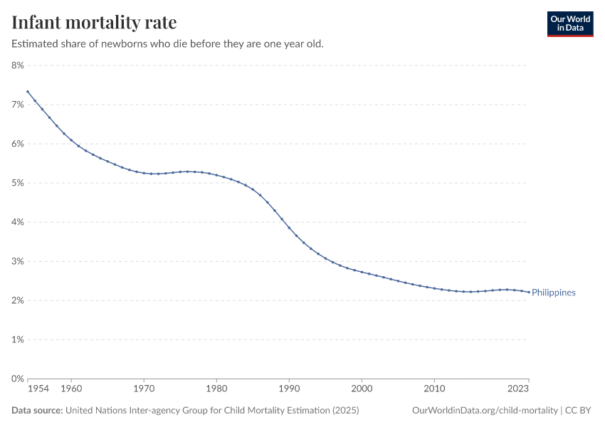 United Nations Inter-agency Group for Child Mortality Estimation (2025) – with minor processing by Our World in Data. “Infant mortality rate” [dataset]. United Nations Inter-agency Group for Child Mortality Estimation, “United Nations Inter-agency Group for Child Mortality Estimation”; Various sources, “Population” [original data]. Retrieved April 23, 2026 from https://archive.ourworldindata.org/20260423-122329/grapher/infant-mortality.html (archived on April 23, 2026).Download