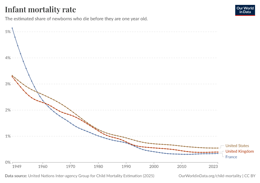 United Nations Inter-agency Group for Child Mortality Estimation (2025) – with major processing by Our World in Data. “Infant mortality rate” [dataset]. United Nations Inter-agency Group for Child Mortality Estimation, “United Nations Inter-agency Group for Child Mortality Estimation”; Various sources, “Population” [original data]. Retrieved January 15, 2026 from https://archive.ourworldindata.org/20250925-233948/grapher/infant-mortality.html (archived on September 25, 2025).