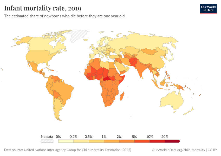 United Nations Inter-agency Group for Child Mortality Estimation (2025) – with major processing by Our World in Data. “Infant mortality rate” [dataset]. United Nations Inter-agency Group for Child Mortality Estimation, “United Nations Inter-agency Group for Child Mortality Estimation”; Various sources, “Population” [original data]. Retrieved December 14, 2025 from https://archive.ourworldindata.org/20250925-233948/grapher/infant-mortality.html (archived on September 25, 2025).