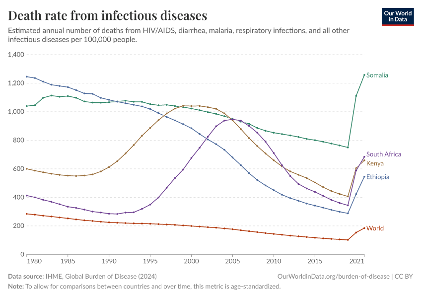 IHME, Global Burden of Disease (2024) – with minor processing by Our World in Data. “Death rate from infectious diseases” [dataset]. IHME, Global Burden of Disease, “Global Burden of Disease - Deaths and DALYs” [original data]. Retrieved December 16, 2025 from https://archive.ourworldindata.org/20250909-093708/grapher/infectious-disease-death-rates.html (archived on September 9, 2025).