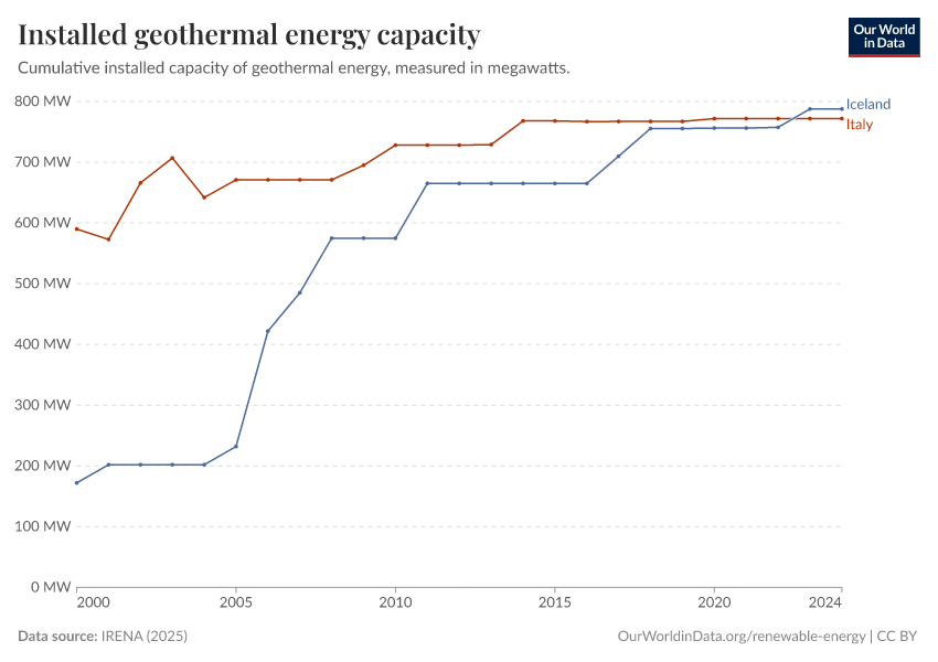 “Data Page: Total geothermal capacity”, part of the following publication: Hannah Ritchie, Pablo Rosado, and Max Roser (2023) - “Energy”. Data adapted from IRENA. Retrieved from https://archive.ourworldindata.org/20250909-093708/grapher/installed-geothermal-capacity.html [online resource] (archived on September 9, 2025).
