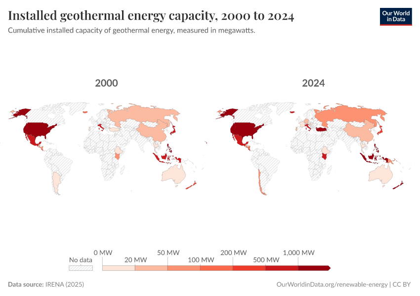 “Data Page: Total geothermal capacity”, part of the following publication: Hannah Ritchie, Pablo Rosado, and Max Roser (2023) - “Energy”. Data adapted from IRENA. Retrieved from https://archive.ourworldindata.org/20250909-093708/grapher/installed-geothermal-capacity.html [online resource] (archived on September 9, 2025).How to cite this data