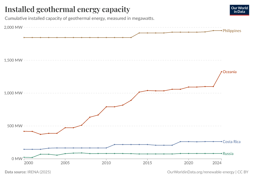 “Data Page: Total geothermal capacity”, part of the following publication: Hannah Ritchie, Pablo Rosado, and Max Roser (2023) - “Energy”. Data adapted from IRENA. Retrieved from https://archive.ourworldindata.org/20250909-093708/grapher/installed-geothermal-capacity.html [online resource] (archived on September 9, 2025).How to cite this data