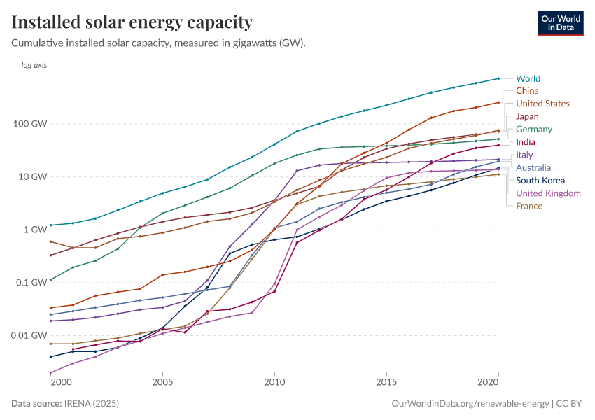 “Data Page: Total solar capacity”, part of the following publication: Hannah Ritchie, Pablo Rosado, and Max Roser (2023) - “Energy”. Data adapted from IRENA. Retrieved from https://archive.ourworldindata.org/20250909-093708/grapher/installed-solar-pv-capacity.html [online resource] (archived on September 9, 2025).