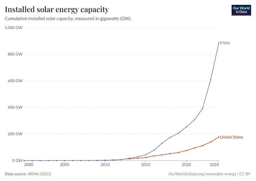 “Data Page: Total solar capacity”, part of the following publication: Hannah Ritchie, Pablo Rosado, and Max Roser (2023) - “Energy”. Data adapted from IRENA. Retrieved from https://archive.ourworldindata.org/20250909-093708/grapher/installed-solar-pv-capacity.html [online resource] (archived on September 9, 2025).