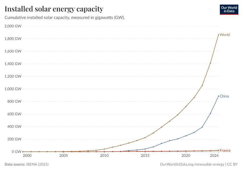 “Data Page: Total solar capacity”, part of the following publication: Hannah Ritchie, Pablo Rosado, and Max Roser (2023) - “Energy”. Data adapted from IRENA. Retrieved from https://archive.ourworldindata.org/20250909-093708/grapher/installed-solar-pv-capacity.html [online resource] (archived on September 9, 2025).How to cite this data