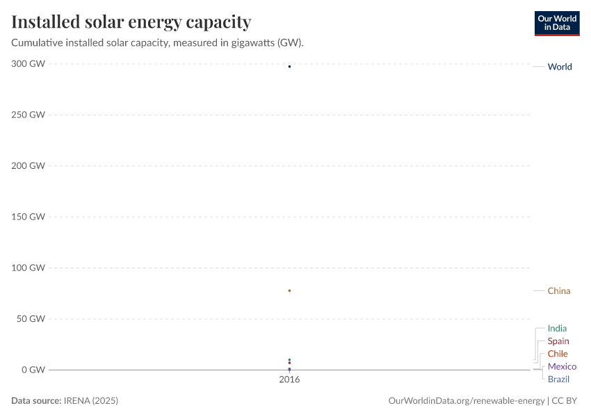 “Data Page: Total solar capacity”, part of the following publication: Hannah Ritchie, Pablo Rosado, and Max Roser (2023) - “Energy”. Data adapted from IRENA. Retrieved from https://archive.ourworldindata.org/20260304-094028/grapher/installed-solar-pv-capacity.html [online resource] (archived on March 4, 2026).