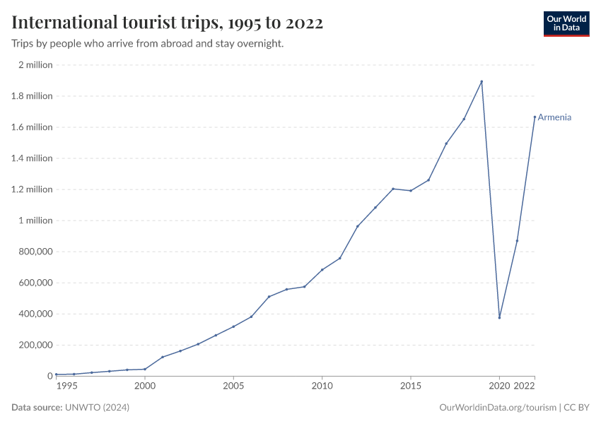 “Data Page: International tourist trips”, part of the following publication: Bastian Herre and Veronika Samborska (2023) - “Tourism”. Data adapted from UNWTO. Retrieved from https://archive.ourworldindata.org/20250909-093708/grapher/international-tourist-trips.html [online resource] (archived on September 9, 2025).How to cite this data
