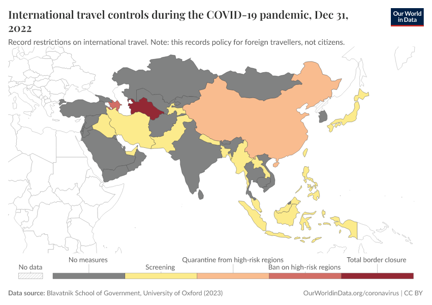 Blavatnik School of Government, University of Oxford (2023) – with minor processing by Our World in Data. “International travel controls during the COVID-19 pandemic” [dataset]. Blavatnik School of Government, University of Oxford, “Government Response Tracker (OxCGRT)” [original data]. Retrieved January 16, 2026 from https://archive.ourworldindata.org/20250909-093708/grapher/international-travel-covid.html (archived on September 9, 2025).