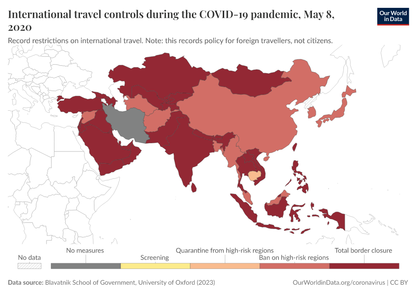 Blavatnik School of Government, University of Oxford (2023) – with minor processing by Our World in Data. “International travel controls during the COVID-19 pandemic” [dataset]. Blavatnik School of Government, University of Oxford, “Government Response Tracker (OxCGRT)” [original data]. Retrieved January 12, 2026 from https://archive.ourworldindata.org/20250909-093708/grapher/international-travel-covid.html (archived on September 9, 2025).