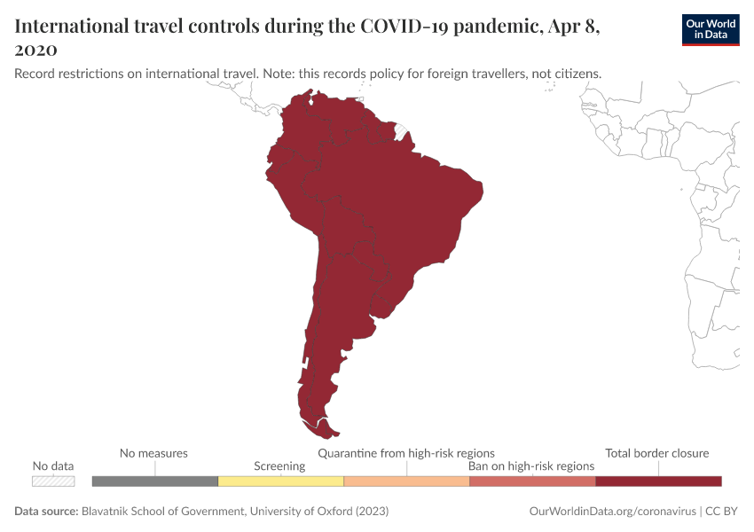 Blavatnik School of Government, University of Oxford (2023) – with minor processing by Our World in Data. “International travel controls during the COVID-19 pandemic” [dataset]. Blavatnik School of Government, University of Oxford, “Government Response Tracker (OxCGRT)” [original data]. Retrieved January 9, 2026 from https://archive.ourworldindata.org/20250909-093708/grapher/international-travel-covid.html (archived on September 9, 2025).