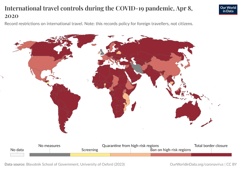 “Data Page: International travel controls during the COVID-19 pandemic”, part of the following publication: Edouard Mathieu, Hannah Ritchie, Lucas Rodés-Guirao, Cameron Appel, Daniel Gavrilov, Charlie Giattino, Joe Hasell, Bobbie Macdonald, Saloni Dattani, Diana Beltekian, Esteban Ortiz-Ospina, and Max Roser (2020) - “COVID-19 Pandemic”. Data adapted from Blavatnik School of Government, University of Oxford. Retrieved from https://archive.ourworldindata.org/20250909-093708/grapher/international-travel-covid.html [online resource] (archived on September 9, 2025).How to cite this data