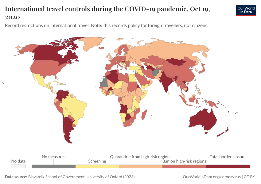 “Data Page: International travel controls during the COVID-19 pandemic”, part of the following publication: Edouard Mathieu, Hannah Ritchie, Lucas Rodés-Guirao, Cameron Appel, Daniel Gavrilov, Charlie Giattino, Joe Hasell, Bobbie Macdonald, Saloni Dattani, Diana Beltekian, Esteban Ortiz-Ospina, and Max Roser (2020) - “COVID-19 Pandemic”. Data adapted from Blavatnik School of Government, University of Oxford. Retrieved from https://archive.ourworldindata.org/20250909-093708/grapher/international-travel-covid.html [online resource] (archived on September 9, 2025).How to cite this data