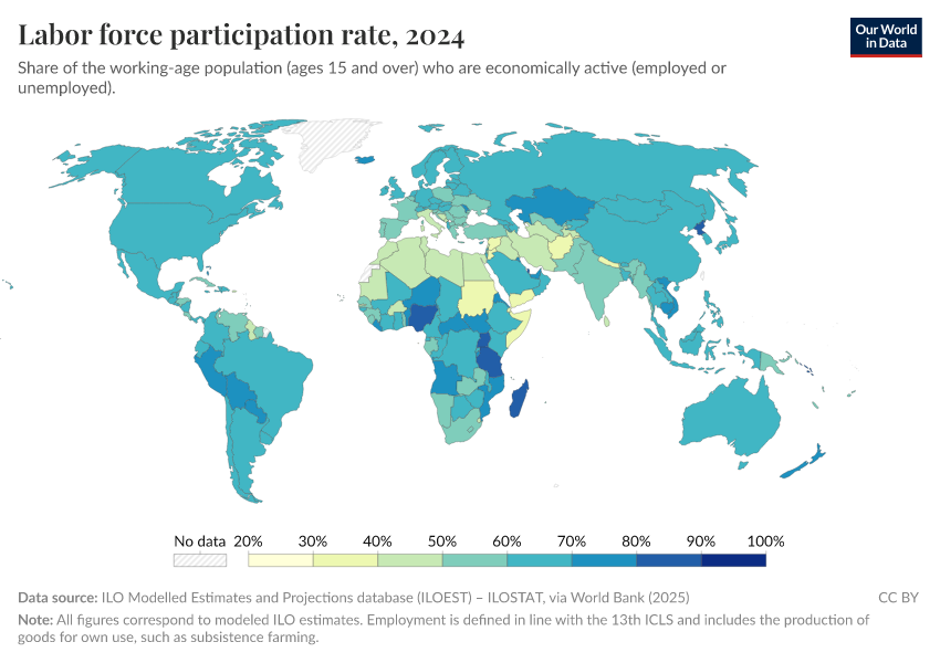“Data Page: Labor force participation rate”. Our World in Data (2025). Data adapted from ILO Modelled Estimates and Projections database (ILOEST) – ILOSTAT, via World Bank. Retrieved from https://archive.ourworldindata.org/20251127-194935/grapher/labor-participation-rate.html [online resource] (archived on November 27, 2025).How to cite this data