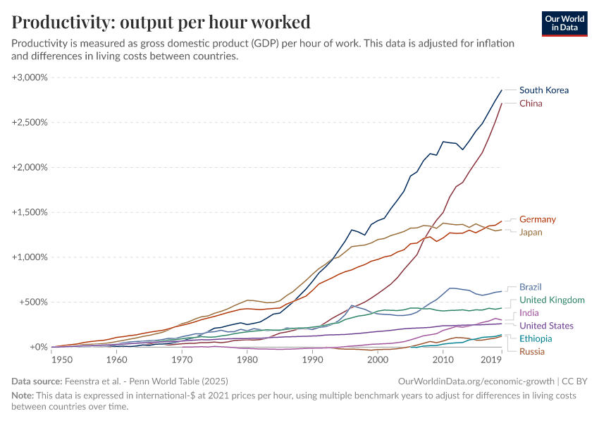 “Data Page: Productivity: output per hour worked”, part of the following publication: Max Roser, Bertha Rohenkohl, Pablo Arriagada, Joe Hasell, Hannah Ritchie, and Esteban Ortiz-Ospina (2023) - “Economic Growth”. Data adapted from Feenstra et al.. Retrieved from https://archive.ourworldindata.org/20251013-111729/grapher/labor-productivity-per-hour-pennworldtable.html [online resource] (archived on October 13, 2025).
