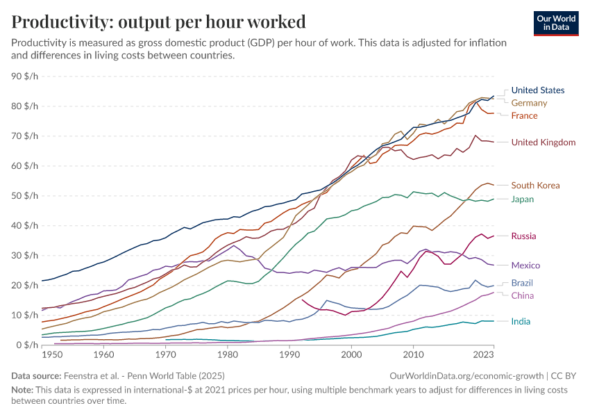Feenstra et al. - Penn World Table (2025) – with major processing by Our World in Data. “Productivity: output per hour worked – Penn World Table – In constant international-$” [dataset]. Feenstra et al., “Penn World Table 11.0” [original data]. Retrieved April 1, 2026 from https://archive.ourworldindata.org/20260304-094028/grapher/labor-productivity-per-hour-pennworldtable.html (archived on March 4, 2026).Download
