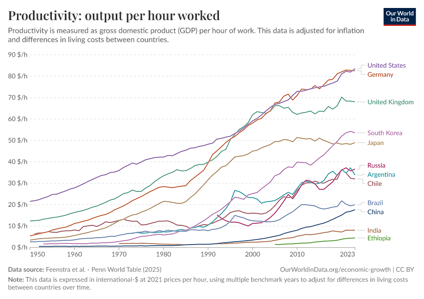 Feenstra et al. - Penn World Table (2025) – with major processing by Our World in Data. “Productivity: output per hour worked – Penn World Table – In constant international-$” [dataset]. Feenstra et al., “Penn World Table 11.0” [original data]. Retrieved March 7, 2026 from https://archive.ourworldindata.org/20260304-094028/grapher/labor-productivity-per-hour-pennworldtable.html (archived on March 4, 2026).