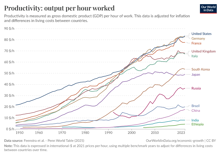 “Data Page: Productivity: output per hour worked”, part of the following publication: Max Roser, Bertha Rohenkohl, Pablo Arriagada, Joe Hasell, Hannah Ritchie, and Esteban Ortiz-Ospina (2023) - “Economic Growth”. Data adapted from Feenstra et al.. Retrieved from https://archive.ourworldindata.org/20260304-094028/grapher/labor-productivity-per-hour-pennworldtable.html [online resource] (archived on March 4, 2026).