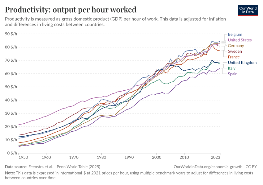 “Data Page: Productivity: output per hour worked”, part of the following publication: Max Roser, Bertha Rohenkohl, Pablo Arriagada, Joe Hasell, Hannah Ritchie, and Esteban Ortiz-Ospina (2023) - “Economic Growth”. Data adapted from Feenstra et al.. Retrieved from https://archive.ourworldindata.org/20260304-094028/grapher/labor-productivity-per-hour-pennworldtable.html [online resource] (archived on March 4, 2026).How to cite this data