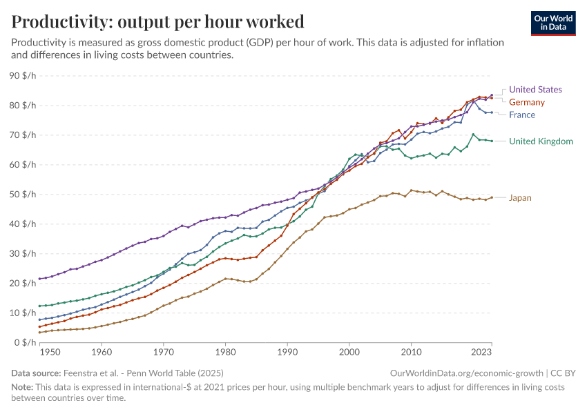 Feenstra et al. - Penn World Table (2025) – with major processing by Our World in Data. “Productivity: output per hour worked – Penn World Table – In constant international-$” [dataset]. Feenstra et al., “Penn World Table 11.0” [original data]. Retrieved December 9, 2025 from https://archive.ourworldindata.org/20251013-111729/grapher/labor-productivity-per-hour-pennworldtable.html (archived on October 13, 2025).