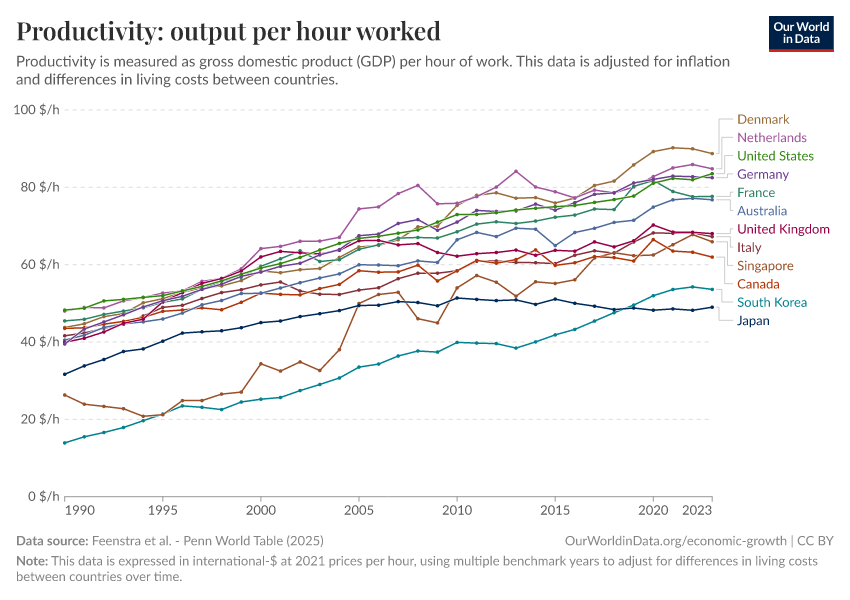 Feenstra et al. - Penn World Table (2025) – with major processing by Our World in Data. “Productivity: output per hour worked – Penn World Table – In constant international-$” [dataset]. Feenstra et al., “Penn World Table 11.0” [original data]. Retrieved December 12, 2025 from https://archive.ourworldindata.org/20251013-111729/grapher/labor-productivity-per-hour-pennworldtable.html (archived on October 13, 2025).