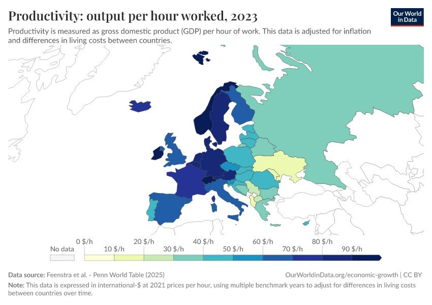 Feenstra et al. - Penn World Table (2025) – with major processing by Our World in Data. “Productivity: output per hour worked – Penn World Table – In constant international-$” [dataset]. Feenstra et al., “Penn World Table 11.0” [original data]. Retrieved April 10, 2026 from https://archive.ourworldindata.org/20260304-094028/grapher/labor-productivity-per-hour-pennworldtable.html (archived on March 4, 2026).Download