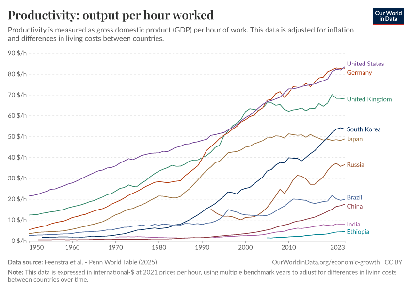 Feenstra et al. - Penn World Table (2025) – with major processing by Our World in Data. “Productivity: output per hour worked – Penn World Table – In constant international-$” [dataset]. Feenstra et al., “Penn World Table 11.0” [original data]. Retrieved March 11, 2026 from https://archive.ourworldindata.org/20260304-094028/grapher/labor-productivity-per-hour-pennworldtable.html (archived on March 4, 2026).