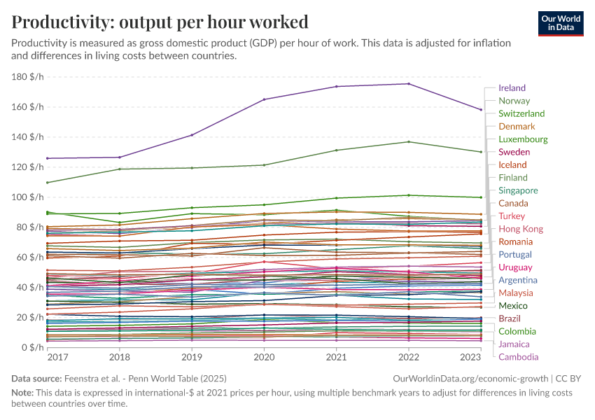 “Data Page: Productivity: output per hour worked”, part of the following publication: Max Roser, Bertha Rohenkohl, Pablo Arriagada, Joe Hasell, Hannah Ritchie, and Esteban Ortiz-Ospina (2023) - “Economic Growth”. Data adapted from Feenstra et al.. Retrieved from https://archive.ourworldindata.org/20251013-111729/grapher/labor-productivity-per-hour-pennworldtable.html [online resource] (archived on October 13, 2025).How to cite this data