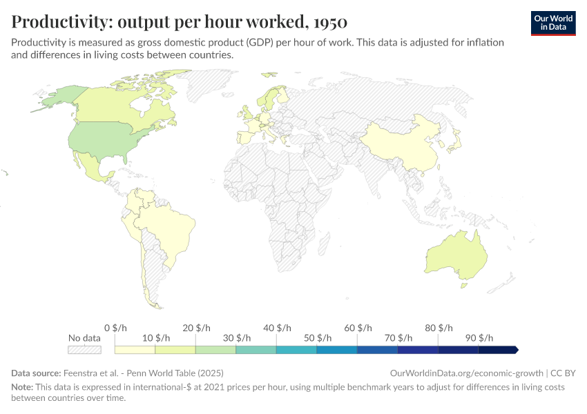 “Data Page: Productivity: output per hour worked”, part of the following publication: Max Roser, Bertha Rohenkohl, Pablo Arriagada, Joe Hasell, Hannah Ritchie, and Esteban Ortiz-Ospina (2023) - “Economic Growth”. Data adapted from Feenstra et al.. Retrieved from https://archive.ourworldindata.org/20251013-111729/grapher/labor-productivity-per-hour-pennworldtable.html [online resource] (archived on October 13, 2025).How to cite this data