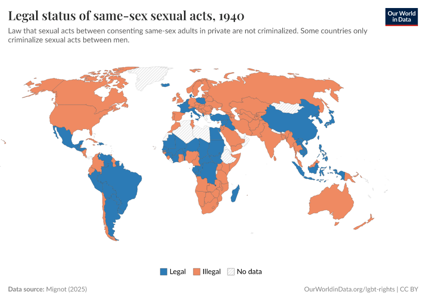 “Data Page: Legal status of same-sex sexual acts”, part of the following publication: Bastian Herre and Pablo Arriagada (2023) - “LGBT+ Rights”. Data adapted from Mignot. Retrieved from https://archive.ourworldindata.org/20250909-093708/grapher/legal-status-of-same-sex-sexual-acts.html [online resource] (archived on September 9, 2025).