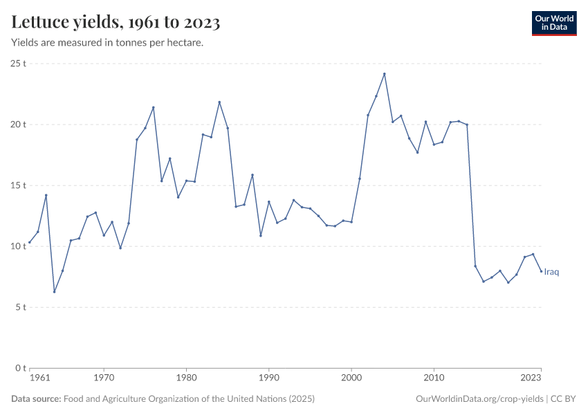 “Data Page: Lettuce yields”, part of the following publication: Hannah Ritchie, Pablo Rosado, and Max Roser (2023) - “Agricultural Production”. Data adapted from Food and Agriculture Organization of the United Nations. Retrieved from https://archive.ourworldindata.org/20251014-161652/grapher/lettuce-yields.html [online resource] (archived on October 14, 2025).
