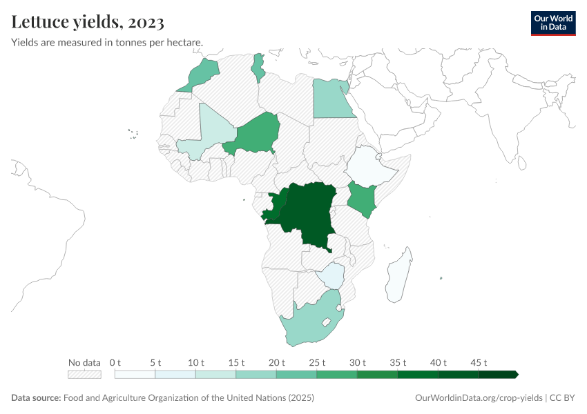 “Data Page: Lettuce yields”, part of the following publication: Hannah Ritchie, Pablo Rosado, and Max Roser (2023) - “Agricultural Production”. Data adapted from Food and Agriculture Organization of the United Nations. Retrieved from https://archive.ourworldindata.org/20251014-161652/grapher/lettuce-yields.html [online resource] (archived on October 14, 2025).How to cite this data