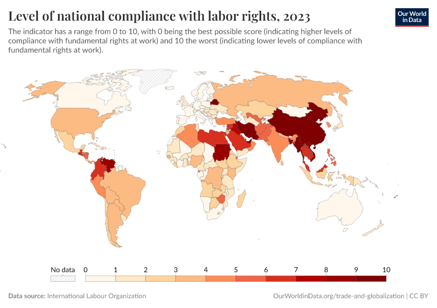 “Data Page: Level of national compliance with labor rights”. Our World in Data (2025). Data adapted from International Labour Organization. Retrieved from https://archive.ourworldindata.org/20250923-151844/grapher/level-of-national-compliance-with-labor-rights.html [online resource] (archived on September 23, 2025).How to cite this data