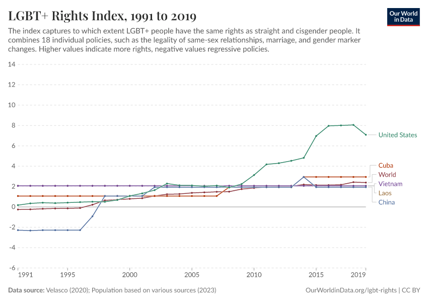 “Data Page: LGBT+ rights index”, part of the following publication: Bastian Herre and Pablo Arriagada (2023) - “LGBT+ Rights”. Data adapted from Velasco, Various sources. Retrieved from https://archive.ourworldindata.org/20251127-165446/grapher/lgbt-rights-index.html [online resource] (archived on November 27, 2025).How to cite this data
