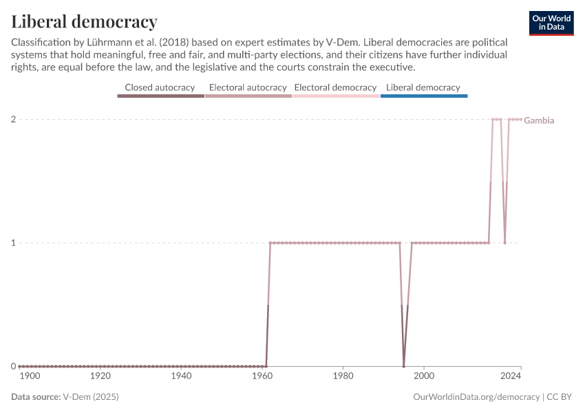 “Data Page: Liberal democracy”, part of the following publication: Bastian Herre, Lucas Rodés-Guirao, and Esteban Ortiz-Ospina (2013) - “Democracy”. Data adapted from V-Dem. Retrieved from https://archive.ourworldindata.org/20250909-093708/grapher/liberal-democracy-row.html [online resource] (archived on September 9, 2025).How to cite this data