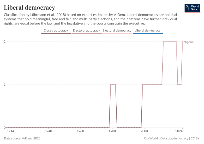 “Data Page: Liberal democracy”, part of the following publication: Bastian Herre, Lucas Rodés-Guirao, and Esteban Ortiz-Ospina (2013) - “Democracy”. Data adapted from V-Dem. Retrieved from https://archive.ourworldindata.org/20250909-093708/grapher/liberal-democracy-row.html [online resource] (archived on September 9, 2025).